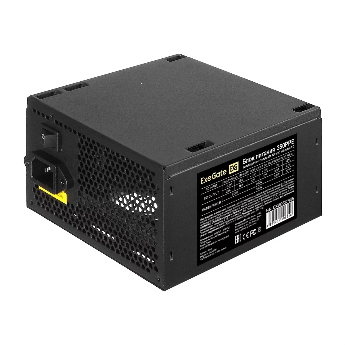 Exegate EX260637RUS Блок питания 350W Exegate 350PPE, ATX, black, APFC, 12cm, 24p+4p, PCI-E, 5*SATA, 3*IDE, FDD