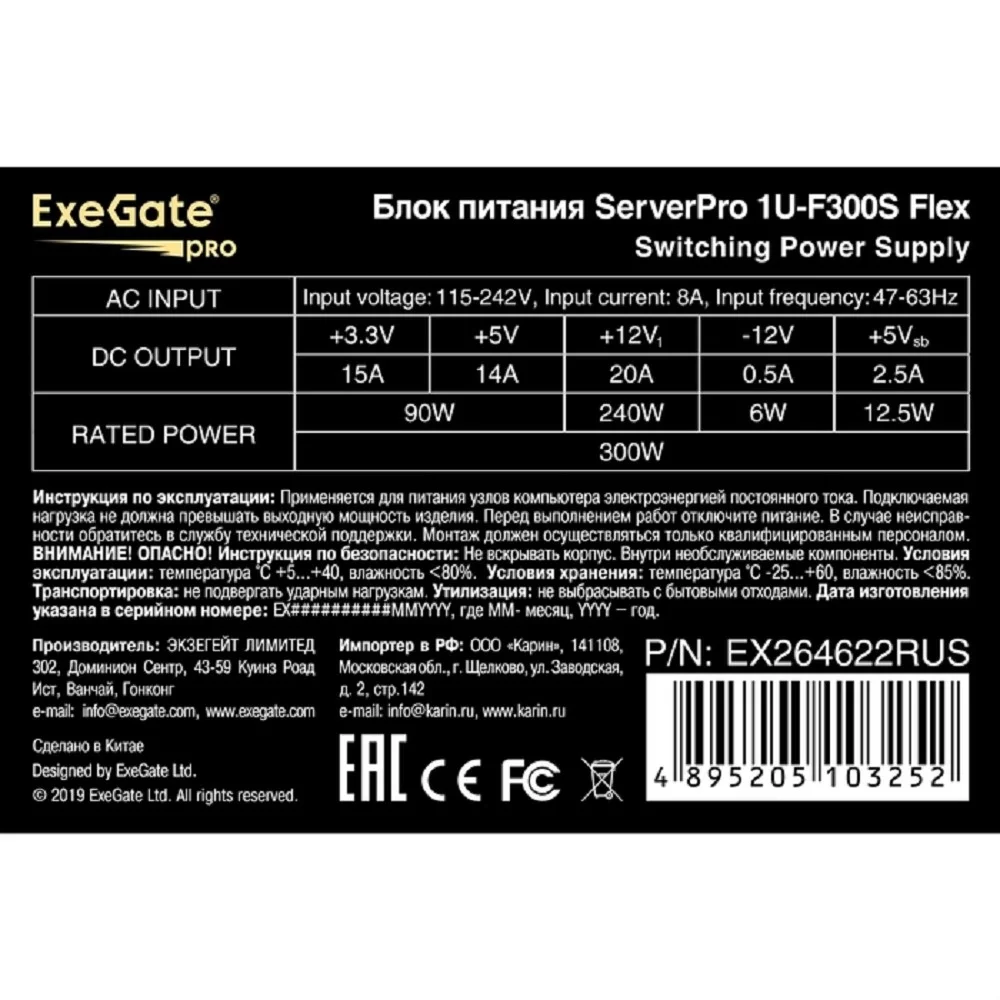 Exegate EX264622RUS Серверный БП 300W Exegate унив. для Flex1U, 24pin, 4pin,3xSATA, 2xIDE