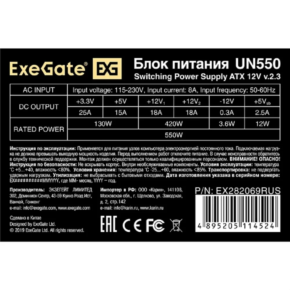 Exegate EX282069RUS Блок питания 550W ExeGate UN550, ATX, 12cm fan, 24p+4p, 6/ 8p PCI-E, 3*SATA, 2*IDE, FDD