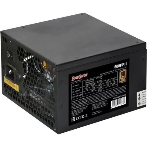 Exegate EX282156RUS-S Блок питания 800W ExeGate 80 PLUS® Bronze 800PPH (ATX, APFC, SC, КПД 89% (80 PLUS Bronze), 12cm fan, 24pin, 2x(4+4)pin, 4xPCI-E, 8xSATA, 4xIDE, RTL (color box), black, кабель 220
