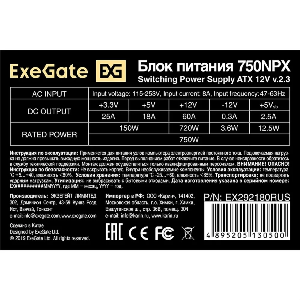 Exegate EX292180RUS Блок питания 750W ExeGate 750NPX (ATX, 12cm fan, 24pin, 4pin, PCIe, 3xSATA, 2xIDE, FDD, black)