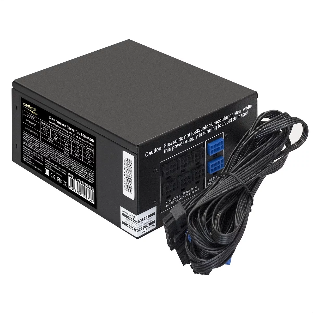 Exegate EX292210RUS Серверный БП 600W ExeGate ServerPRO-600RADS (ATX, for 3U+ cases, APFC, КПД 80% (80 PLUS), 14cm fan, 24pin, (4+4)pin, PCIe, 5xSATA, 4xIDE, FDD, Cable Management, black)