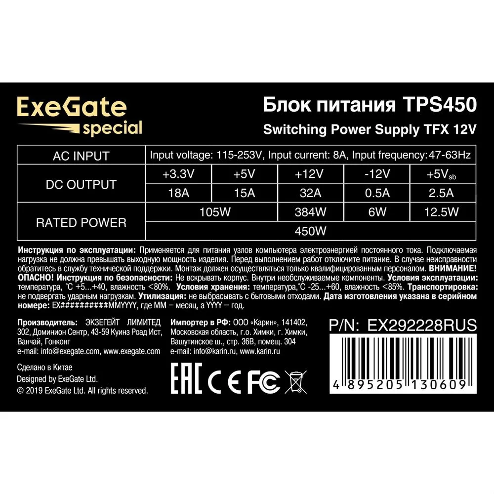 Exegate EX292228RUS Блок питания 450W ExeGate TPS450 (TFX, 8cm fan, 24pin, 4+4pin, 3xSATA, 2xIDE, black)