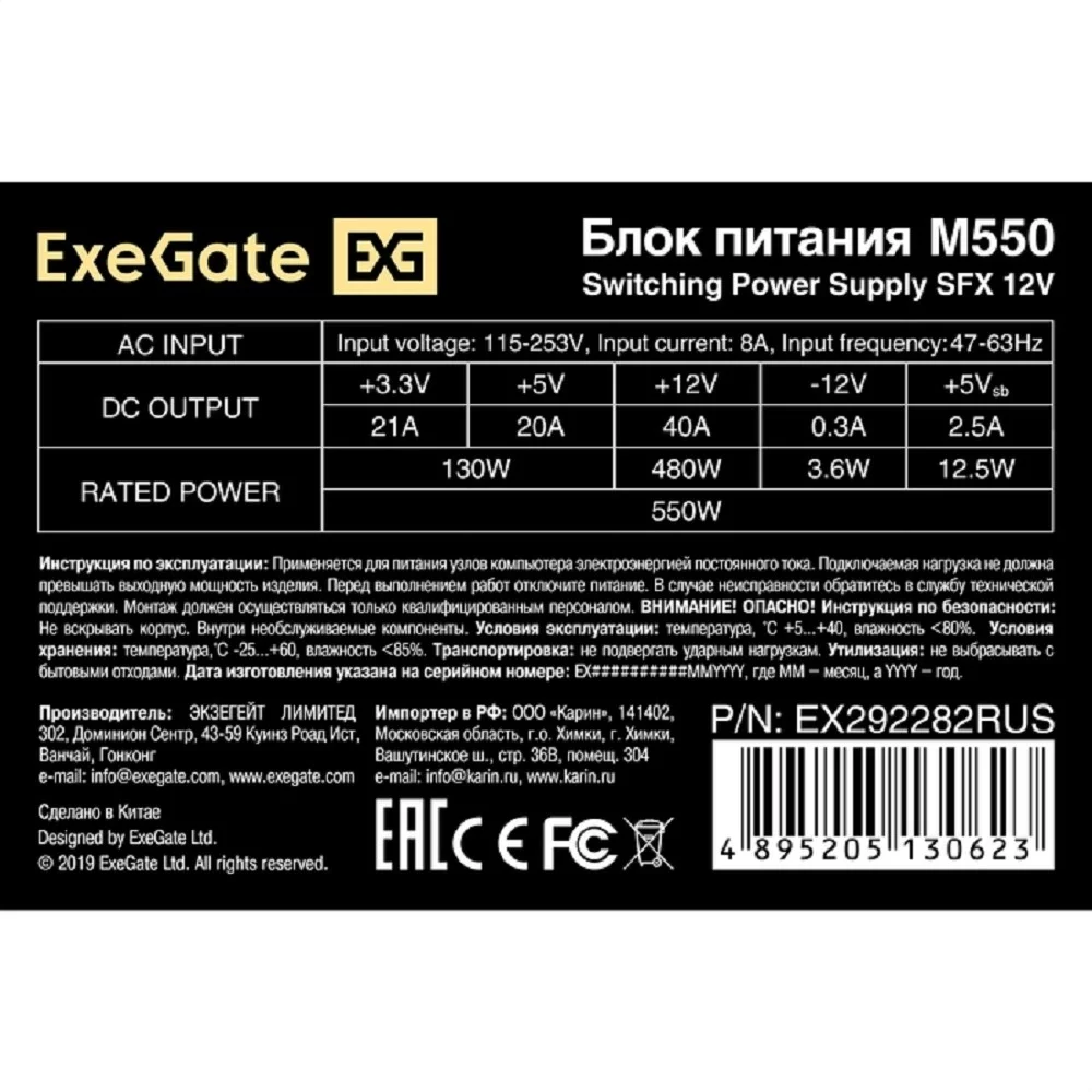 Exegate EX292282RUS Блок питания 550W ExeGate M550 (SFX, APFC, КПД 87% (80 PLUS Silver), 8cm fan, 24pin, (4+4)pin, 2xPCI-E, 3xSATA, 2xIDE, black)