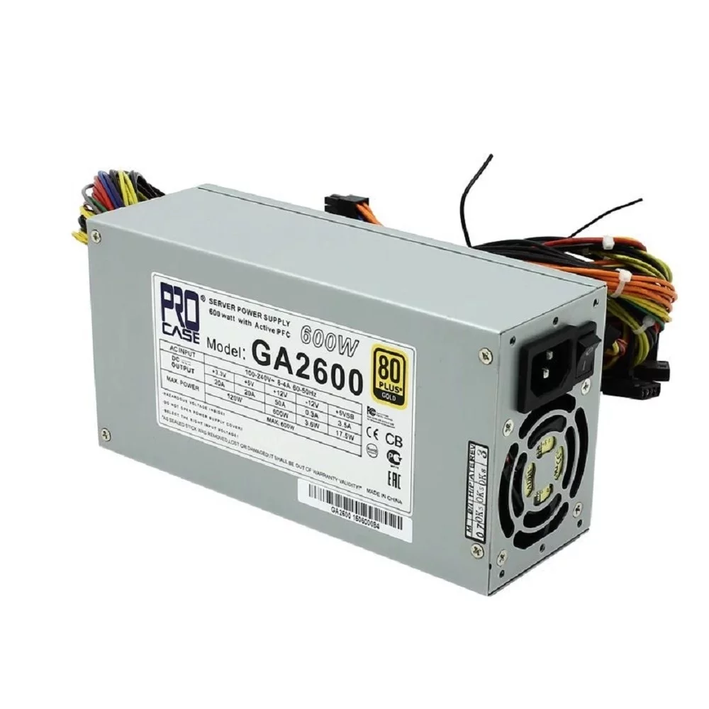Procase GA2600 Блок питания ATX 2U 2FAN (600W), 80+ Gold, 200*100*70mm, Активный PFC, +5B=20A, +12B=50A, +3,3B=20A, 5VSB=3.5A, -12B=0.3A, Защита от перегрузки 105-150%, Входное напряжение 160-240В