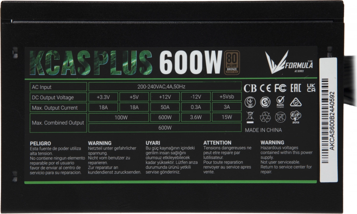 Блок питания Formula ATX 600W AC KCAS PLUS 80+ bronze 24pin APFC 120mm fan 7xSATA RTL (KCAS PLUS 600)