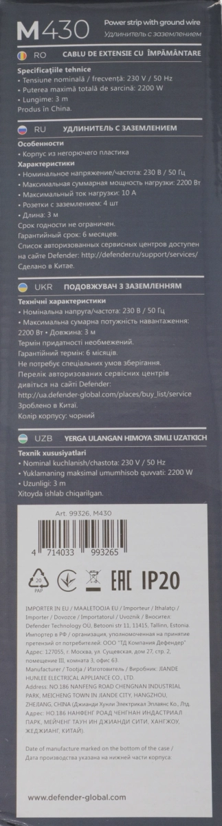Defender Удлинитель с заземлением M430 3.0 м, 4 розетки, черный (99326)