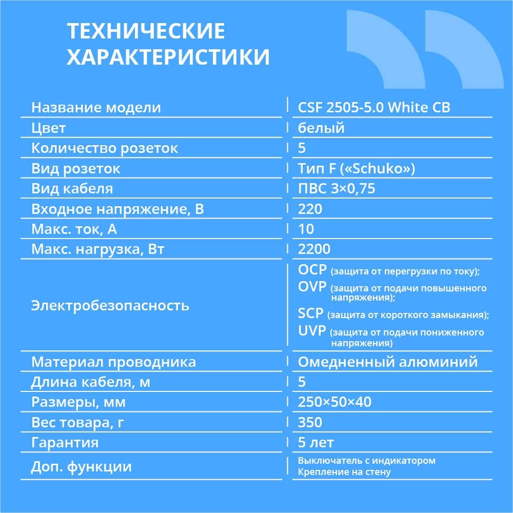 CBR Сетевой фильтр CSF 2505-5.0 White CB, 5 евророзеток, длина кабеля 5 метров, цвет белый (коробка)