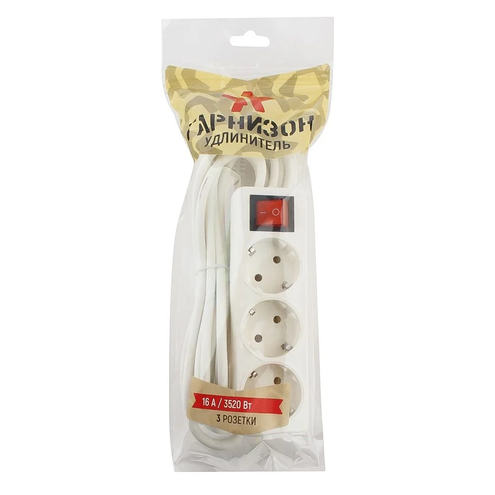 Удлинитель Гарнизон ELB-G3-W-3 3 евророзетки с выключателем и заземлением, допустимый ток 16А, длина 3м. (050746)