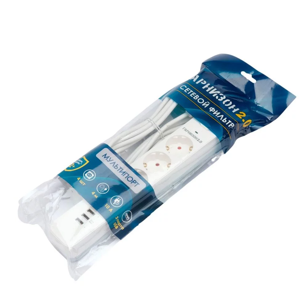 Гарнизон Сетевой фильтр 2.0 EPS-4-U3-W-4 Мультипорт, 4р, 10А, 3xUSB, 4м, ур.защиты 2+, белый, пакет (21447)