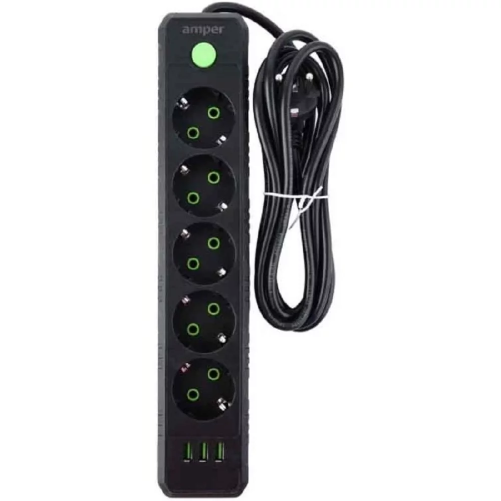 Amper сетевой удлинитель, 4,0м, 5 розеток, 10А, 2500 Вт, 3usb, черный. (JH-1033U-4B)