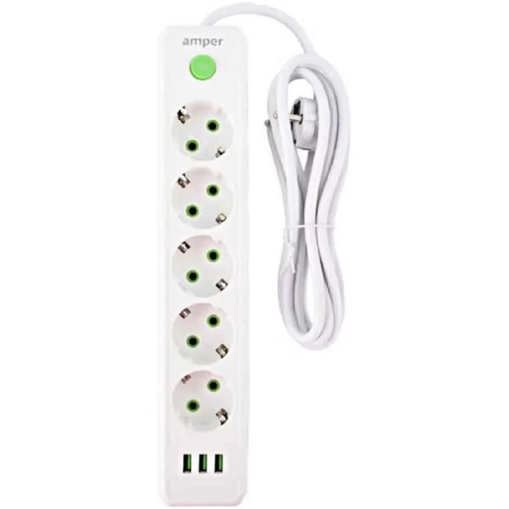 Amper сетевой удлинитель, 4,0м, 5 розеток, 10А, 2500 Вт, 3usb, белый. (JH-1033U-4W)