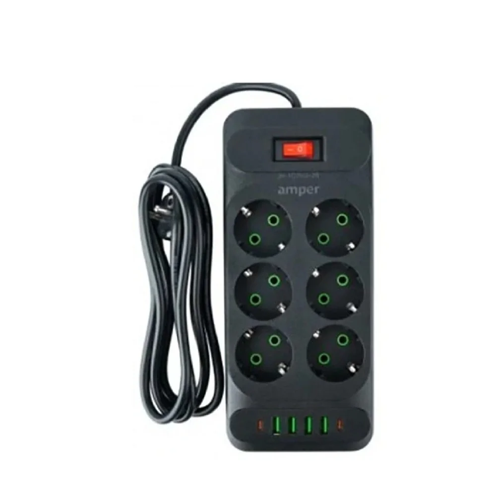 Amper сетевой удлинитель, 2,0м, 6 розеток, 10А, 2500 Вт, 4usb,2Type-C, черный. (JH-1076U-2B)