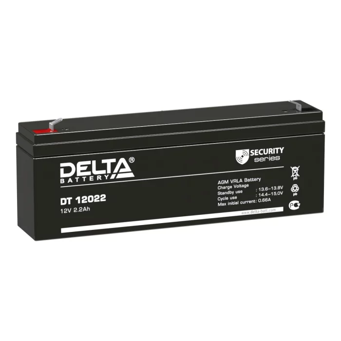 Батарея DELTA серия DT, DT 12022, напряжение 12В, емкость 2.2Ач (разряд 20 часов), макс. ток разряда (5 сек.) 44А, макс. ток заряда 0.66А, свинцово-кислотная типа AGM, клеммы F1, ДxШxВ 179х35х61мм., вес 0.94кг., срок службы 5 лет./ Battery DELTA series D