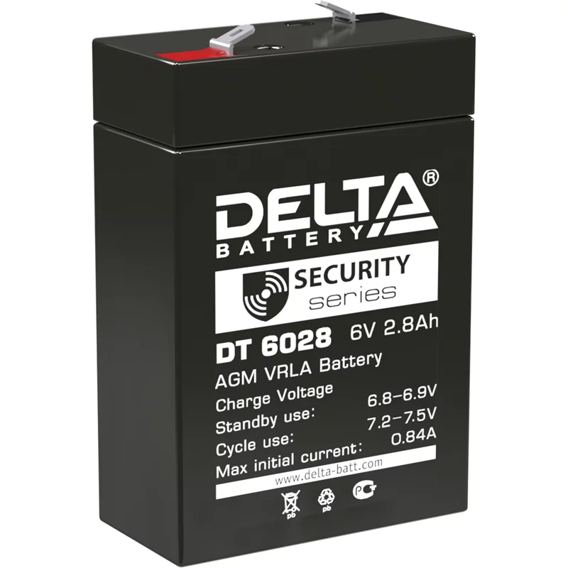 Батарея DELTA серия DT, DT 6028, напряжение 6В, емкость 2.8Ач (разряд 20 часов), макс. ток разряда (5 сек.) 48А, макс. ток заряда 0.84А, свинцово-кислотная типа AGM, клеммы F1, ДxШxВ 66х33х97мм., вес 0.61кг., срок службы 5 лет./ Battery DELTA series DT,