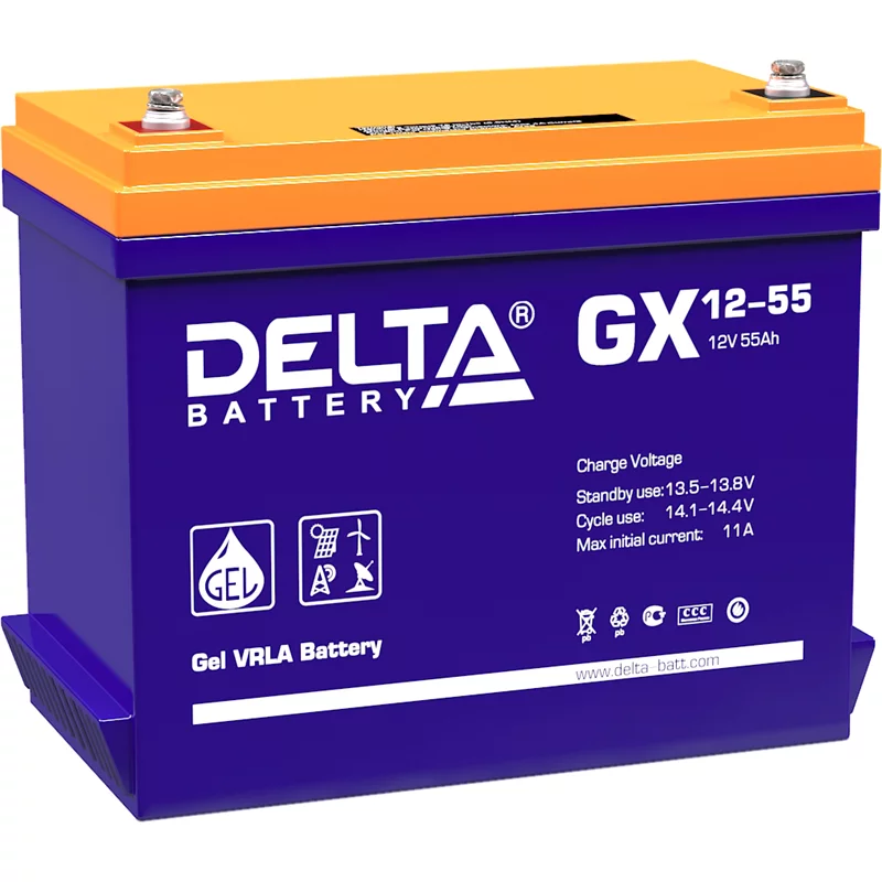 Батарея DELTA серия GX, GX 12-55, напряжение 12В, емкость 55Ач (разряд 20 часов), макс. ток разряда (5 сек.) 550А, макс. ток заряда 10.9А, свинцово-кислотная типа GEL, клеммы под болт М6, ДxШxВ 239х132х205мм., вес 17.3кг., срок службы 15 лет./ Battery DE