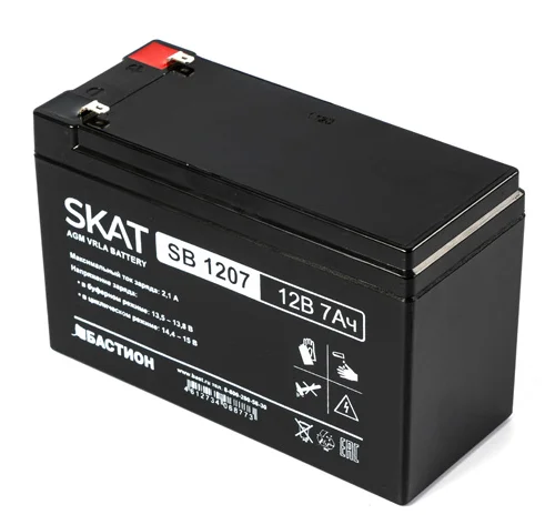 2533 SKAT SB 1207, 12В, 7Ач, максимальный ток заряда 2,1 А. Тип клеммы — F1 нож. Размер корпуса — 66х151х100. Вес — 2,1 кг. Срок службы — 6 лет. Гарантия - 18 месяцев.