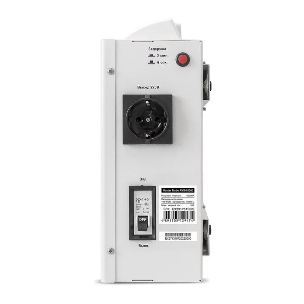 Exegate EX291751RUS Стабилизатор напряжения ExeGate Master Turbo AVS-10000 (10000ВА, 100-265В, цветной дисплей, 220В±8%, КПД 98%, 5 уровней защиты, задержка, усиленный метал.корпус, клем.колодка+еврор