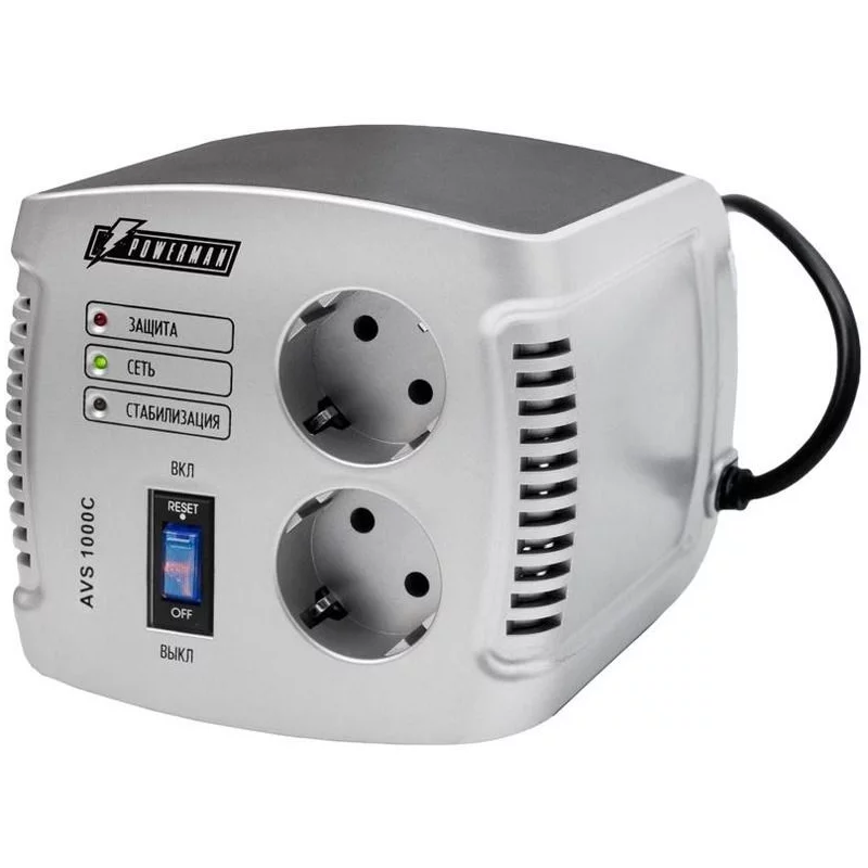 Стабилизатор POWERMAN AVS 1000C, ступенчатый регулятор, 1000ВА/500Вт, 150-280В, максимальный входной ток 8А, 2 евророзетки, IP-20, напольный, 151мм (POWERMAN AVS 1000 C)