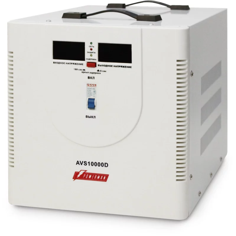 Стабилизатор POWERMAN AVS 10000D, ступенчатый регулятор, цифровые индикаторы уровней напряжения, 10000ВА, 140-260В, максимальный входной ток 50А, клеммная колодка, IP-20, напольный, 410мм х 280мм х 310мм, 15.5 кг./ Stabilizer POWERMAN AVS 10000D, step-ty