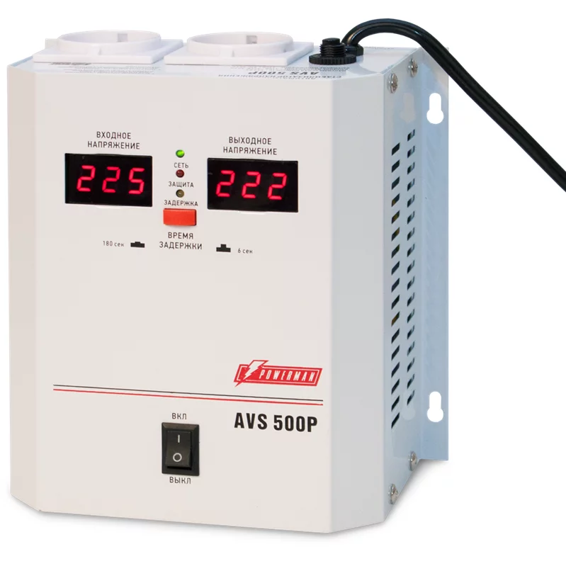 Стабилизатор POWERMAN AVS 500P, ступенчатый регулятор, цифровые индикаторы уровней напряжения, 500ВА, 110-260В, максимальный входной ток 5А (POWERMAN AVS-500P)