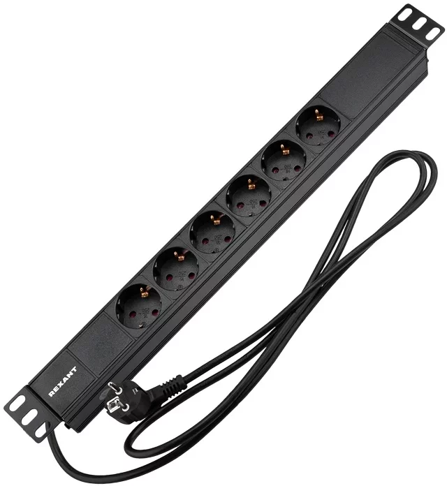 Rexant (04-0101-1) Блок распределения питания для 19" шкафов, горизонтальный, 6 розеток СЕЕ 7/4, 16A, без выкл, алюм корп, шнур 2м, вилка СЕЕ 7/7