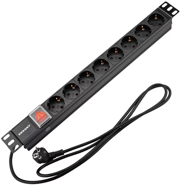 Rexant (04-0104-1) Блок распределения питания для 19" шкафов, горизонтальный, 8 розеток СЕЕ 7/4, 16A, выкл, алюм корп, шнур 2м, вилка СЕЕ 7/7