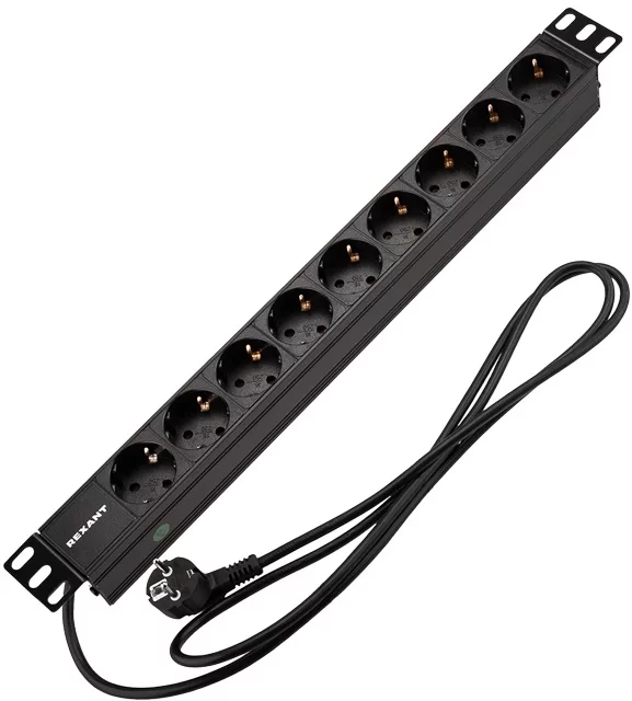 Rexant (04-0105-1) Блок распределения питания для 19" шкафов, горизонтальный, 9 розеток СЕЕ 7/4, 16A, без выкл, алюм корп, шнур 2м, вилка СЕЕ 7/7