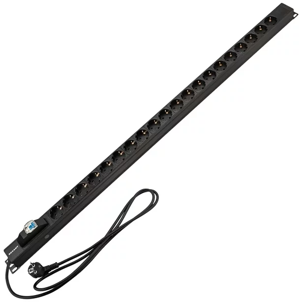 Rexant (04-0201-2) Блок распределения питания для 19" шкафов, вертикальный, 20 розеток СЕЕ 7/4, 16А, автомат защиты, алюм корп, шнур 2м, вилка СЕЕ 7/7