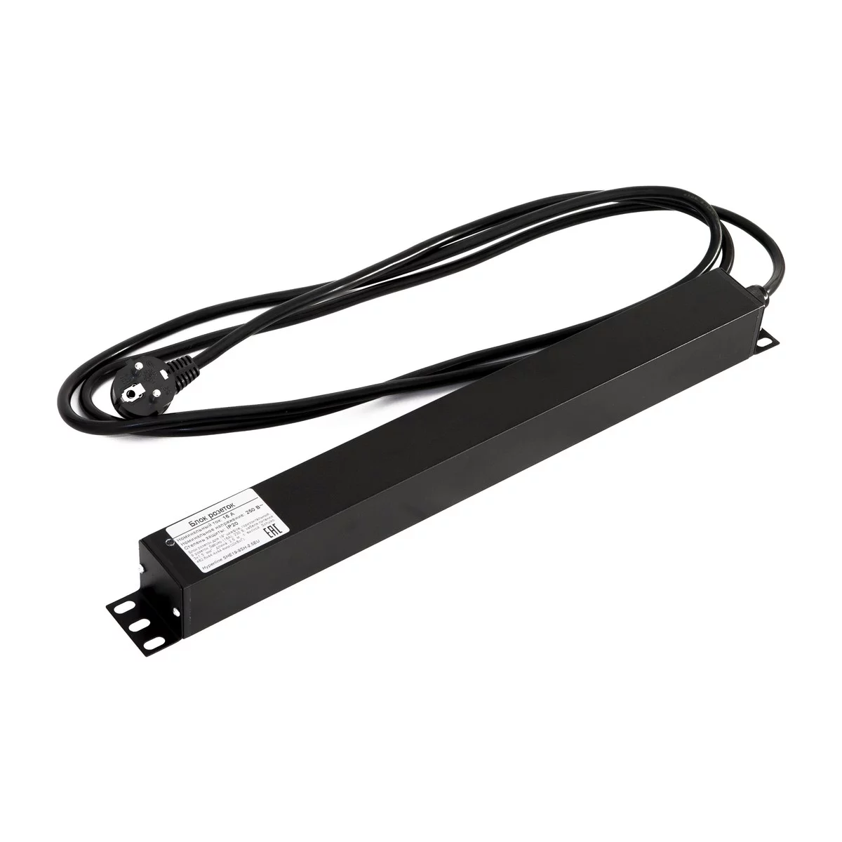 Hyperline SHE19-9SH-2.5EU Блок розеток для 19" шкафов, горизонтальный, 9 розеток Schuko, кабель питания 2.5м (3х1.5мм2) с вилкой Schuko 16A, 250В, 482.6x44.4x44.4мм (ШхГхВ), корпус алюминий, цвет черный