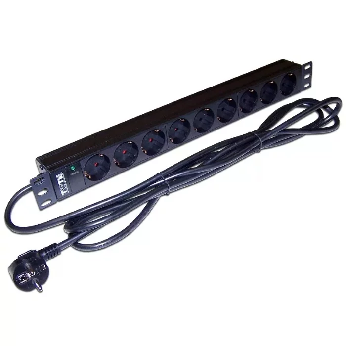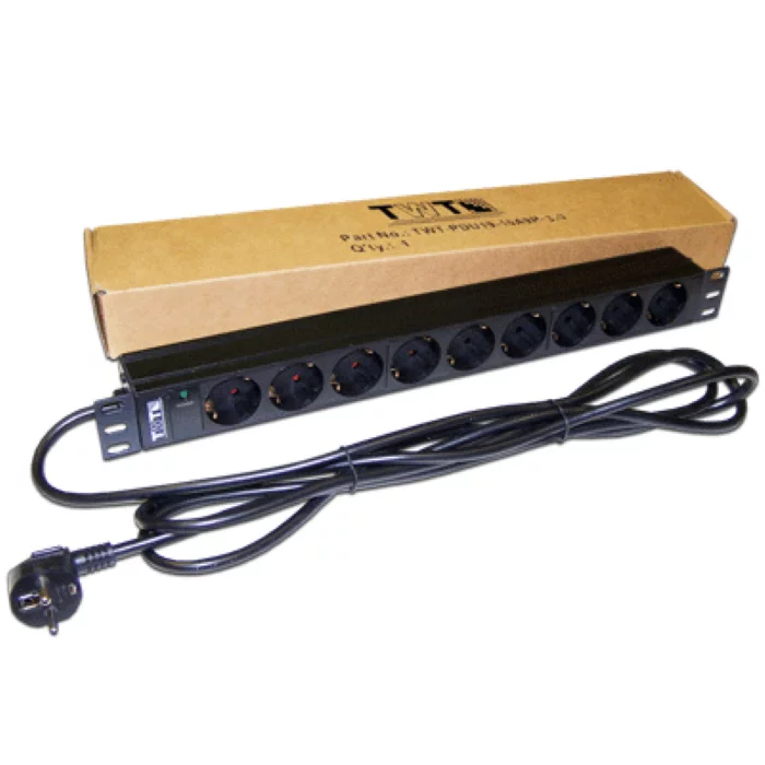 Блок розеток TWT 19" 16А на 9 гнезд Schuko (CEE 7/ 7), с вилкой Schuko, без выключателя, шнур 3м. (TWT-PDU19-16A9P-3.0)