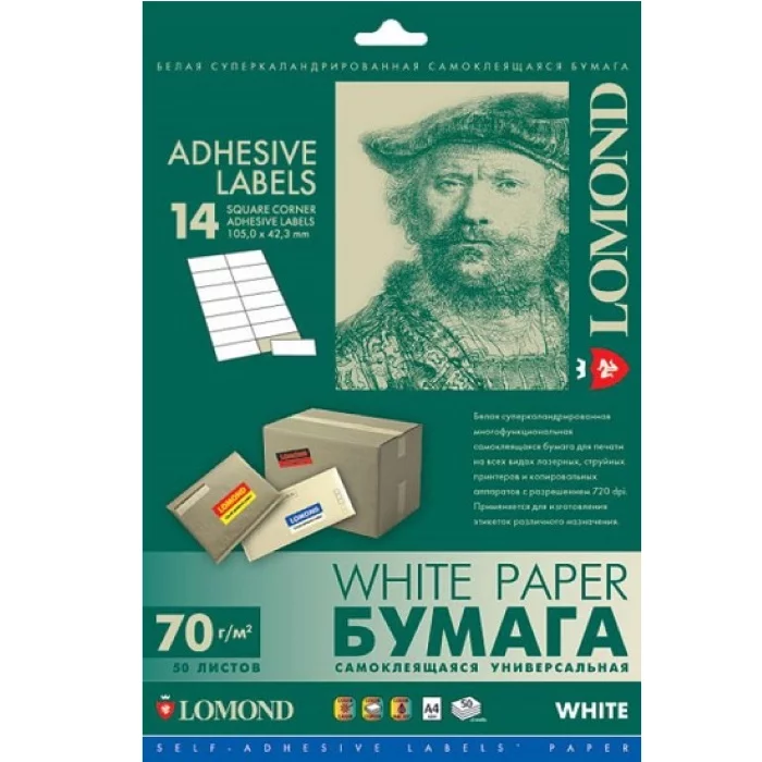 Бумага LOMOND самоклеящаяся ,универсальная для этикеток, A4, 14 делен. (105 x 42.3 мм), 70 г/ м2, 50 листов (2100095)