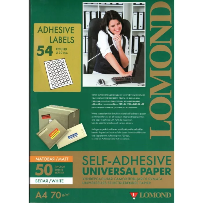 Самоклеящаяся бумага LOMOND универсальная для этикеток, А4/ 54-дел.D=30 мм/ 70 г/м2/ 50 л (2103005)