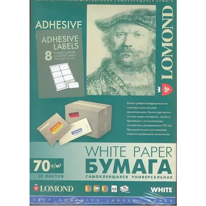 Самоклеящаяся бумага LOMOND универсальная для этикеток, фА4 8-дел.(99,0мм х 67,75мм), с закругл.краями 70 г/м2. (2104245)